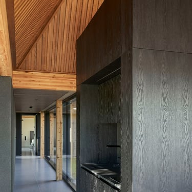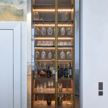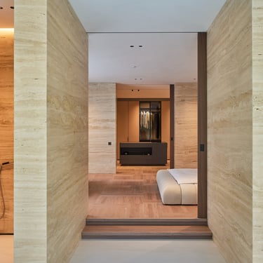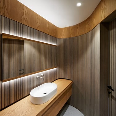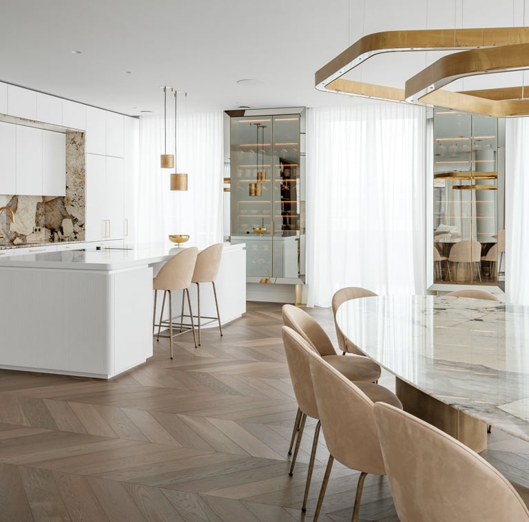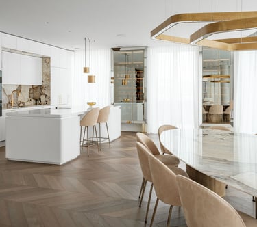 Minimalistinė L formos virtuvė su natūralaus ąžuolo fasadais iki lubų. Šviesus marmurinis stalviršis ir backsplash, juoda technika, integruotas grindjuosčių vėdinimas. Švara, šiluma ir prabanga viename.