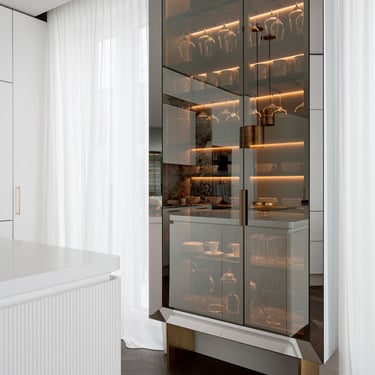 Griežta linijinė kompozicija: švelnūs beige viršutinieji fasadai + giliai pilki apatiniai ir kolona. Marmurinis stalviršis su venomis, integruota technika, atviros lentynos. Harmoningas šilumos ir modernumo balansas.